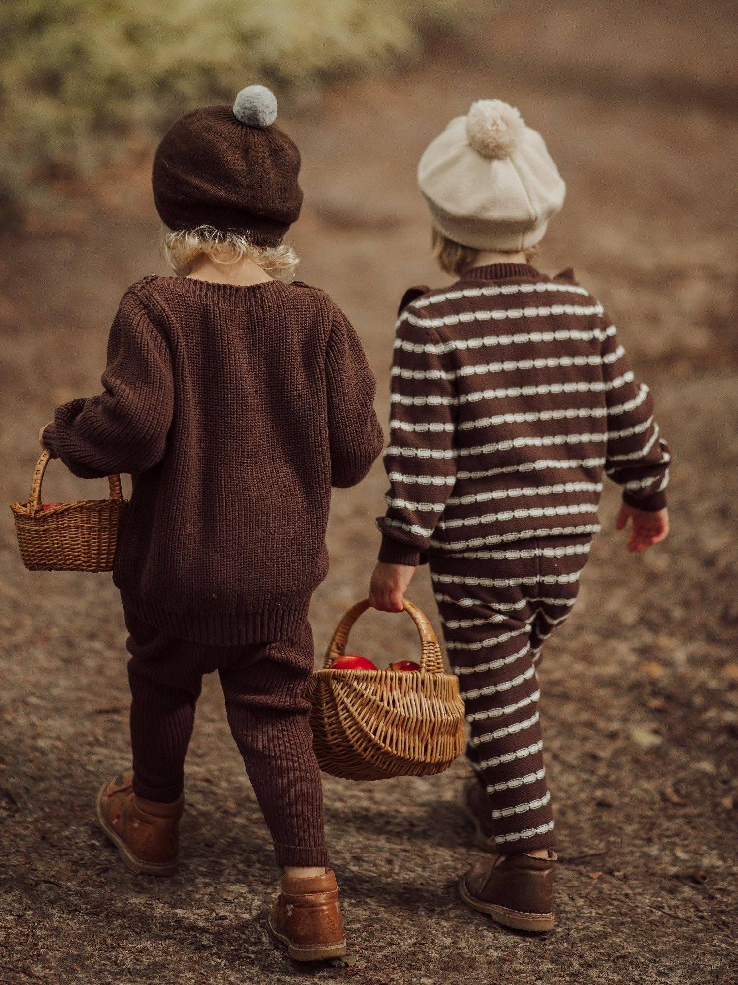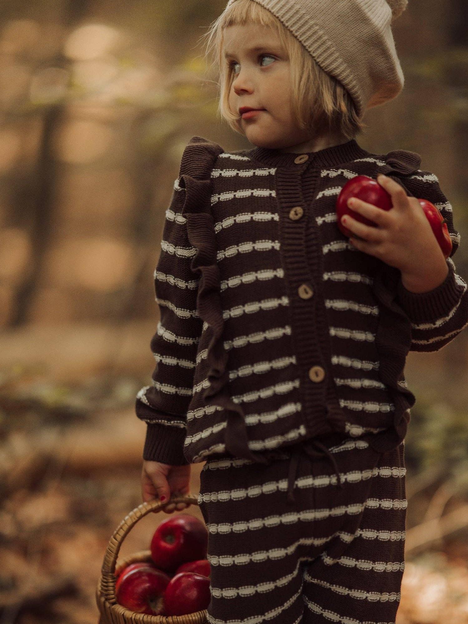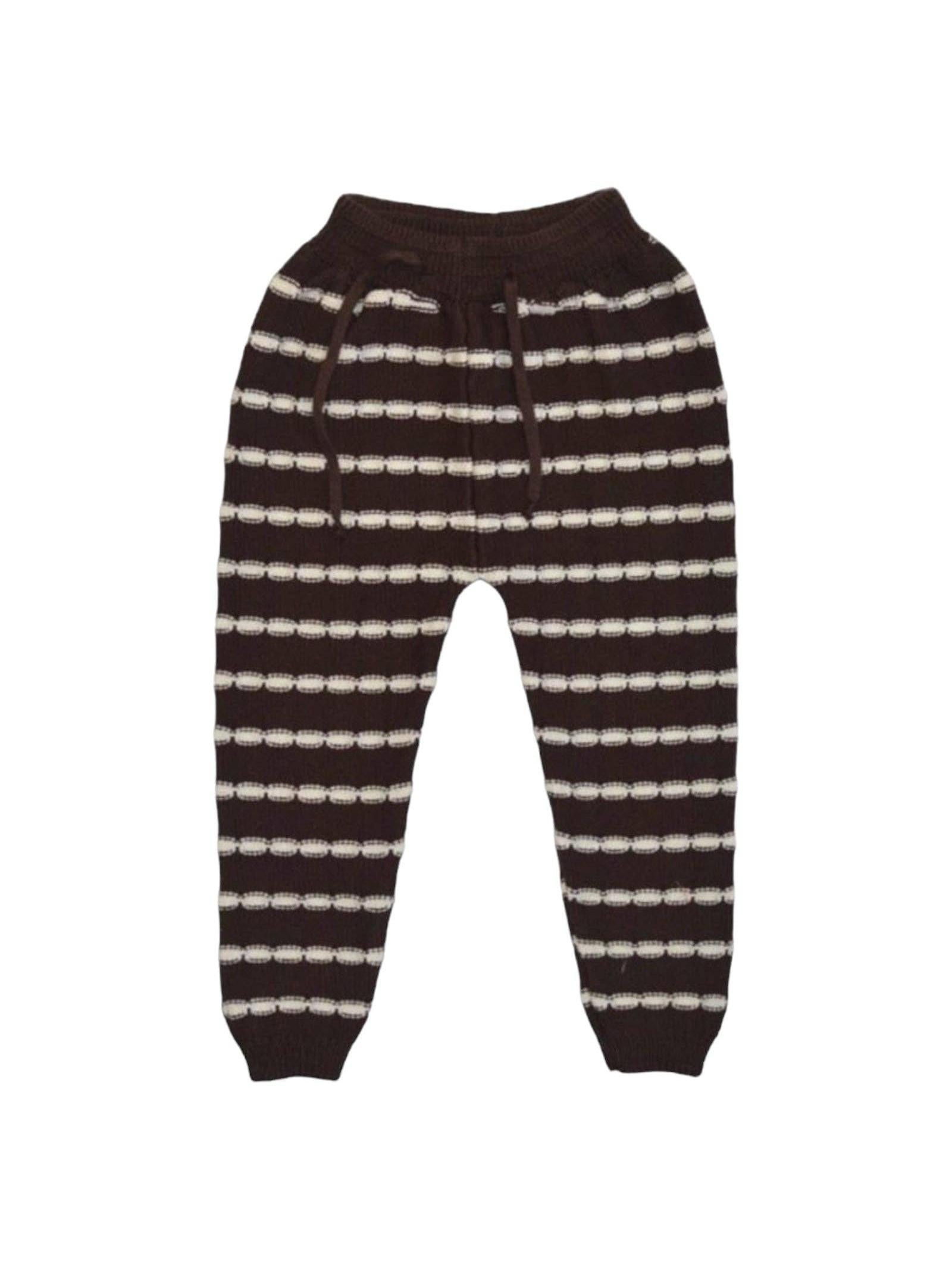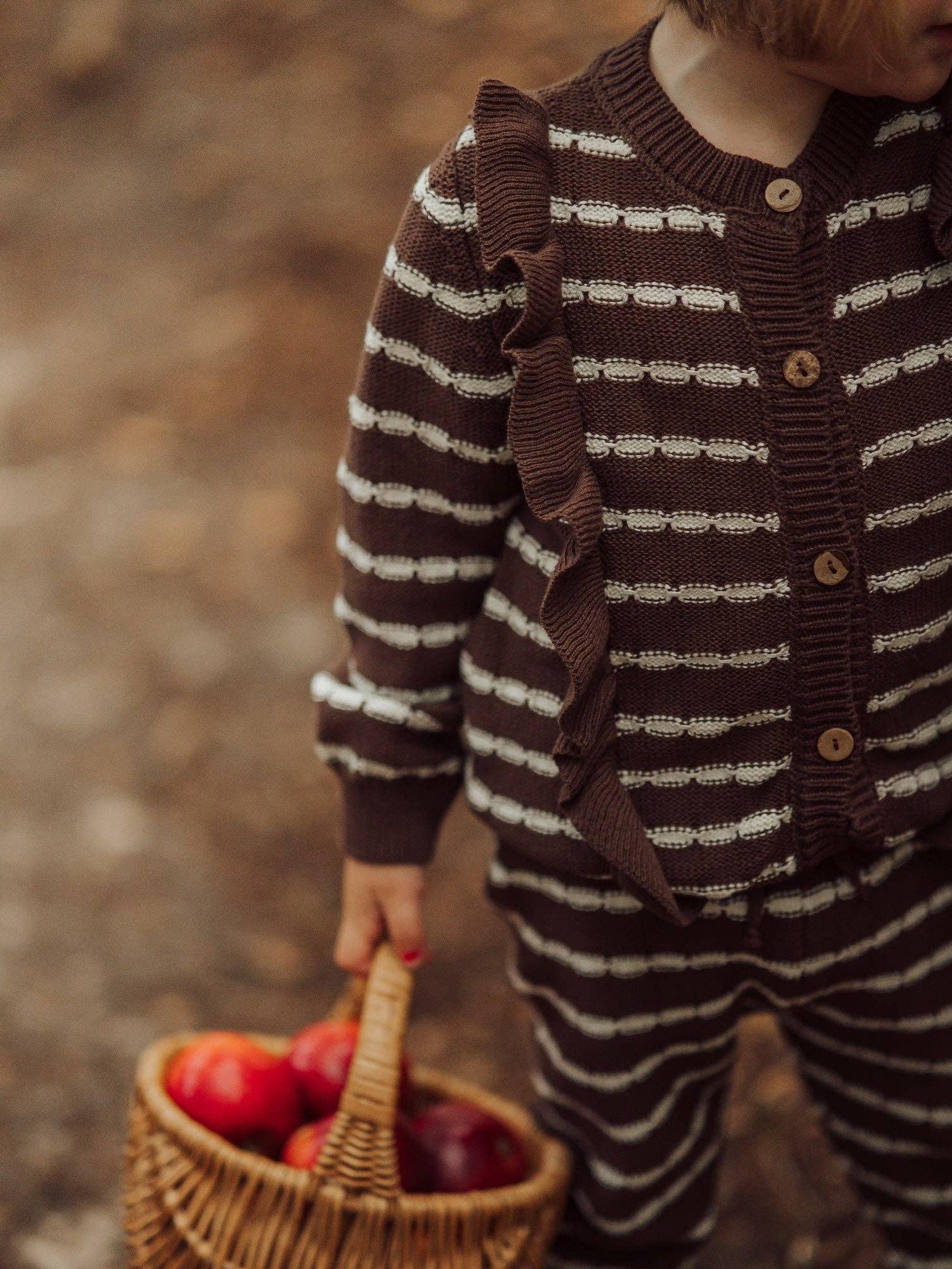 A pair of wonderfully soft and incredibly cute brown knitted trousers with white horizontal stripes. Combine with the Alba Striped Ruffle cardigan for a cozy set.