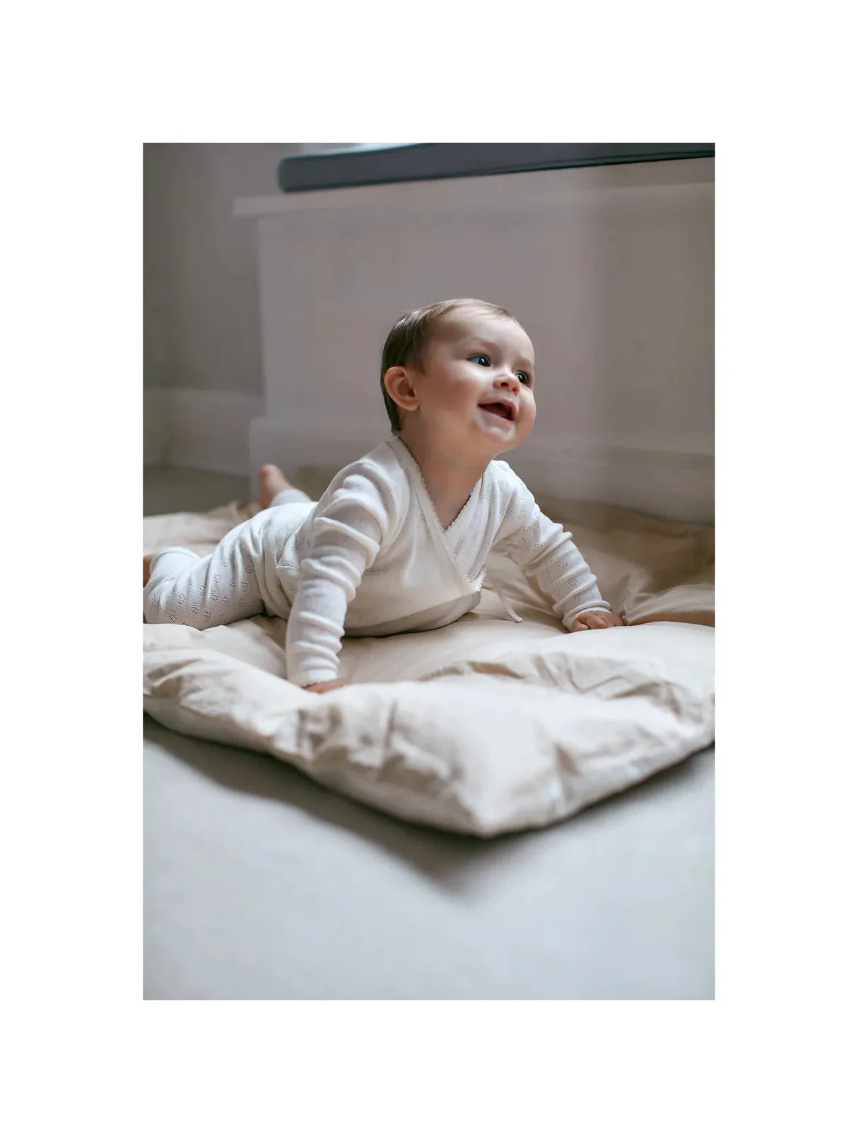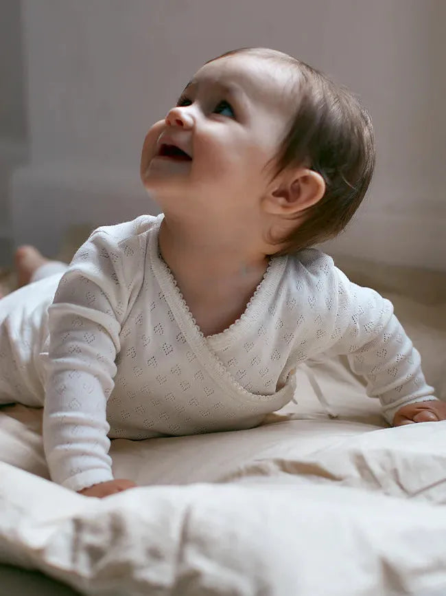 Wrap your baby in softness and comfort with the Pointelle Cross-Over Bodystocking from Copenhagen Colors.