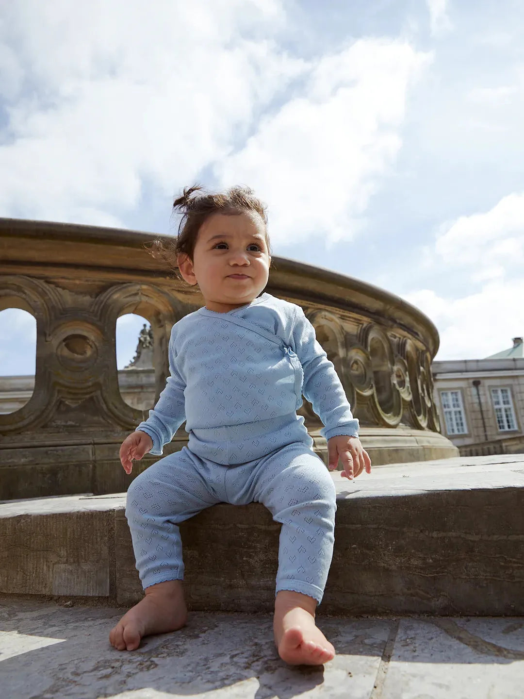 The dusty blue tone brings a calm and elegant touch, while the stretchy waistband ensures a snug yet gentle fit for your baby’s comfort.