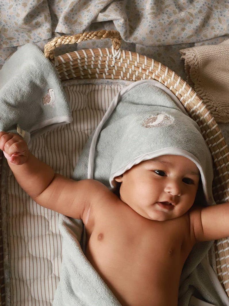 This organic cotton terry towelling bath mitt is super soft on your little one's skin. Featuring a sweet little quail.
