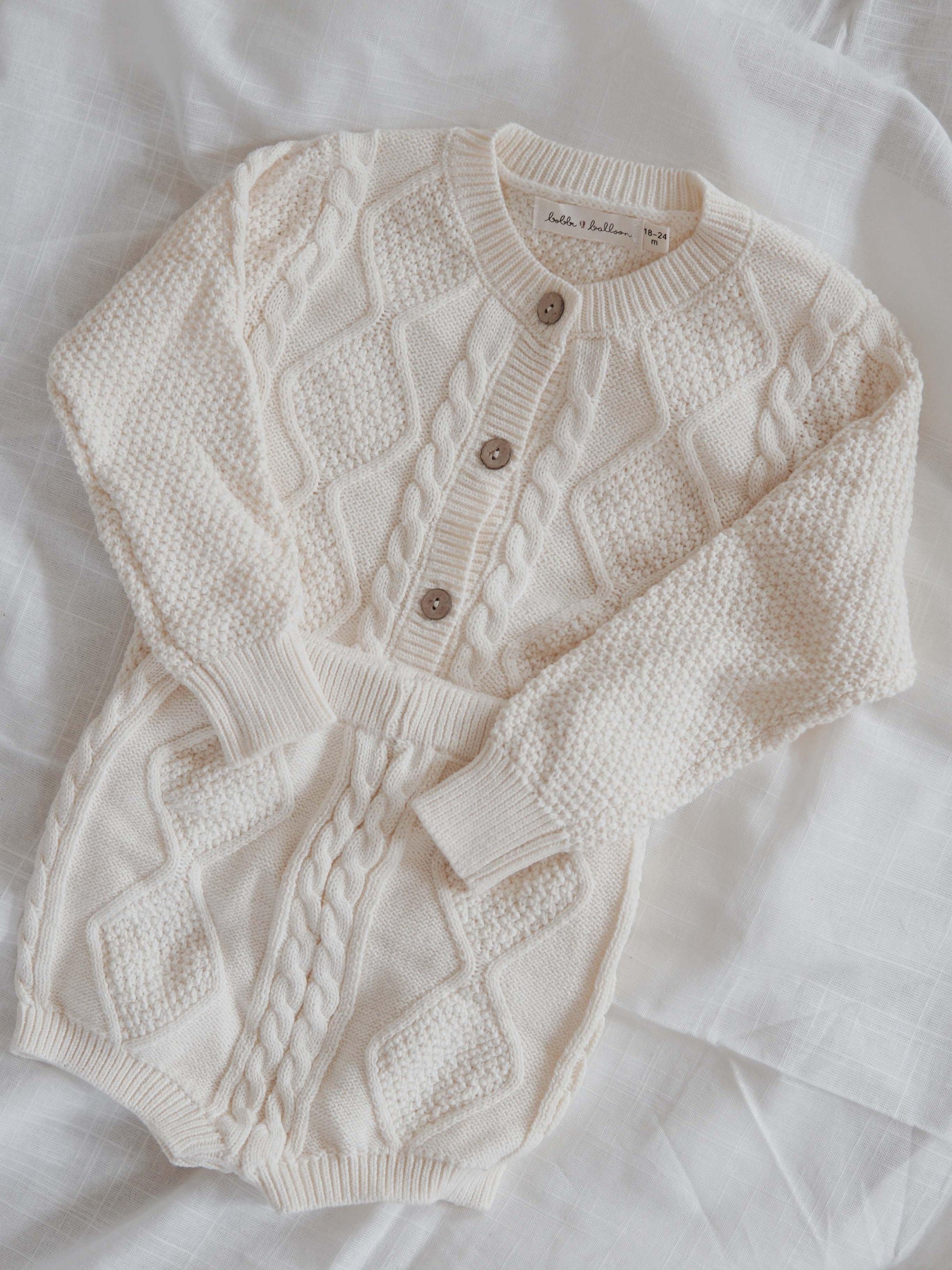 A classic Knit Cardigan and Shorts Set in a soft buttercream color. This timeless set has a beautiful moss stitch and cable knit pattern knitted in the softest cotton. It is both practical, classic and unisex. The perfect little outfit for every child.