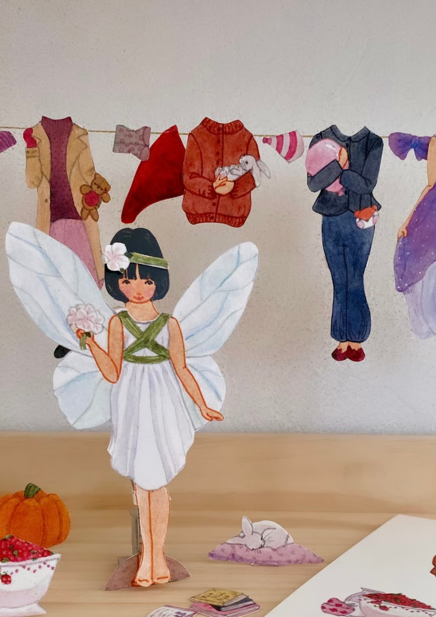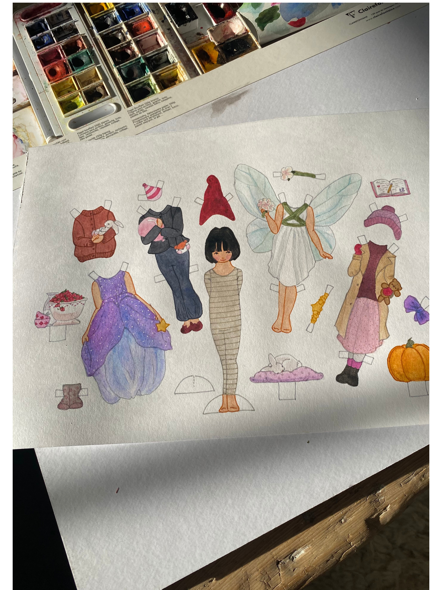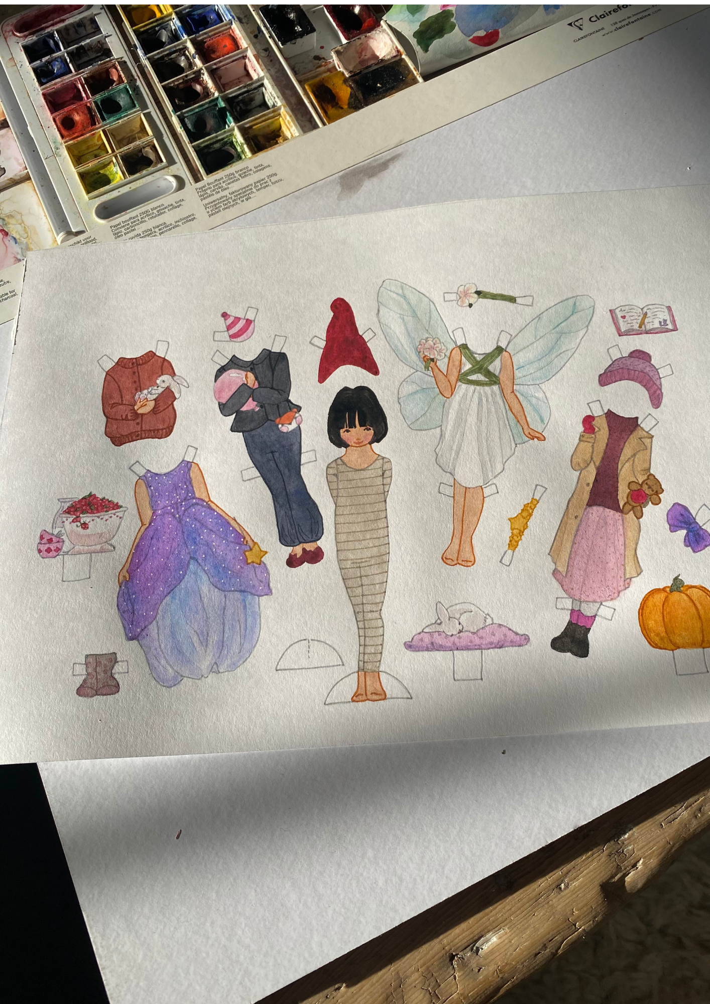 Unique Danish design printed on sturdy 300g A4 card (one-sided print). Meet Mona – a charming paper doll who loves nature walks, picking flowers, and spending time with her little rabbit, Ninus. Cut her out and dress her for Christmas, New Year, birthdays, or cosy days with friends.