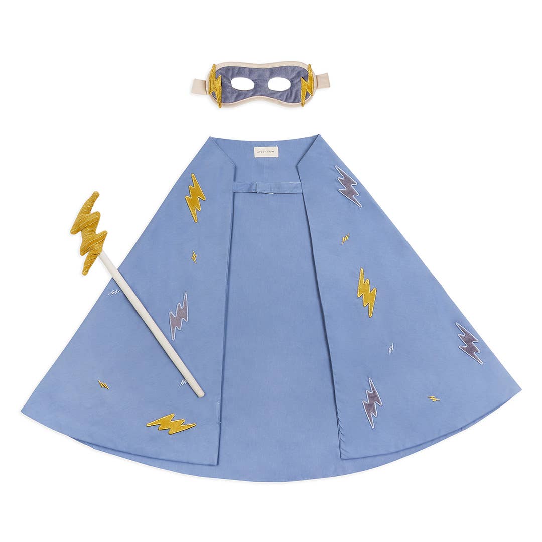 Let your little superhero save the world in this fabulous 3 piece dress up set. Featuring a lightening bolt wand, velvet mask and cotton percale cape all made from organic cotton and recycled polyester.