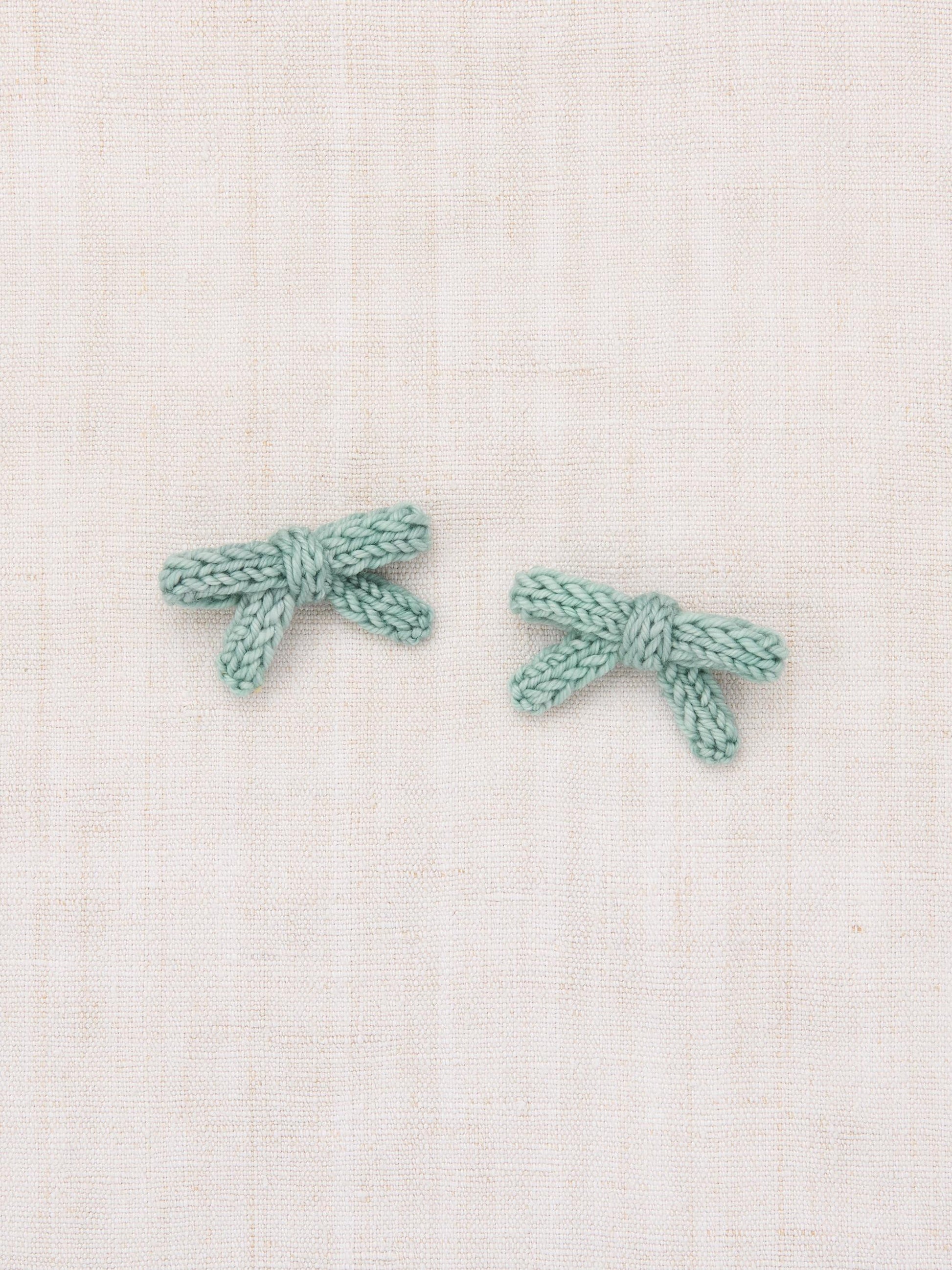 Hand-knit from 100% soft Merino wool and mounted on durable alligator clips, these slim bows are perfect for pairing with your favorite knitwear, adding a subtle pop of color, or gifting to someone special. Each bow is made by hand, and the Merino yarn is hand-dyed in small batches, creating gentle tonal variations that make every piece beautifully unique. Whether styled for everyday charm or a special occasion, this set brings timeless elegance in the softest shade of sage.