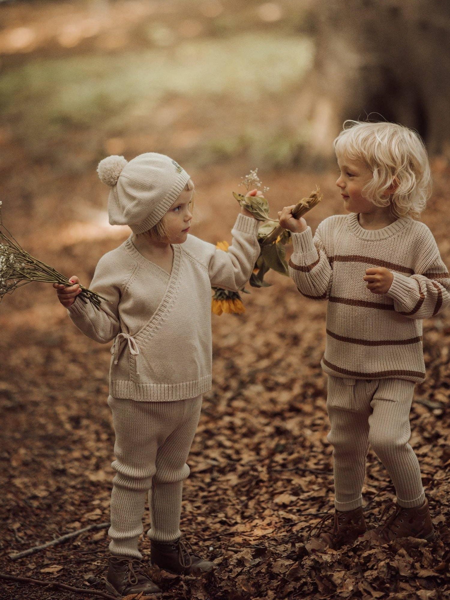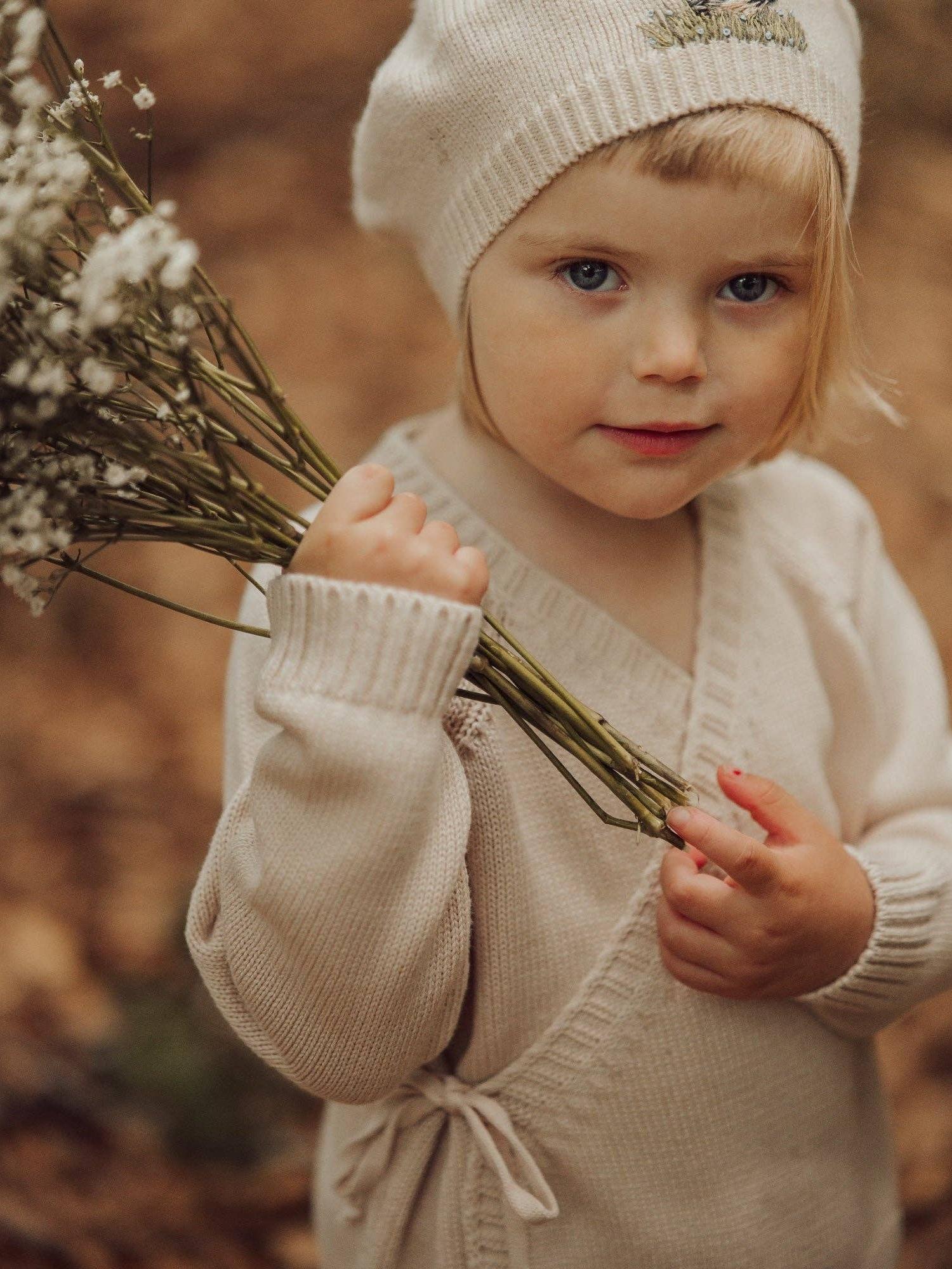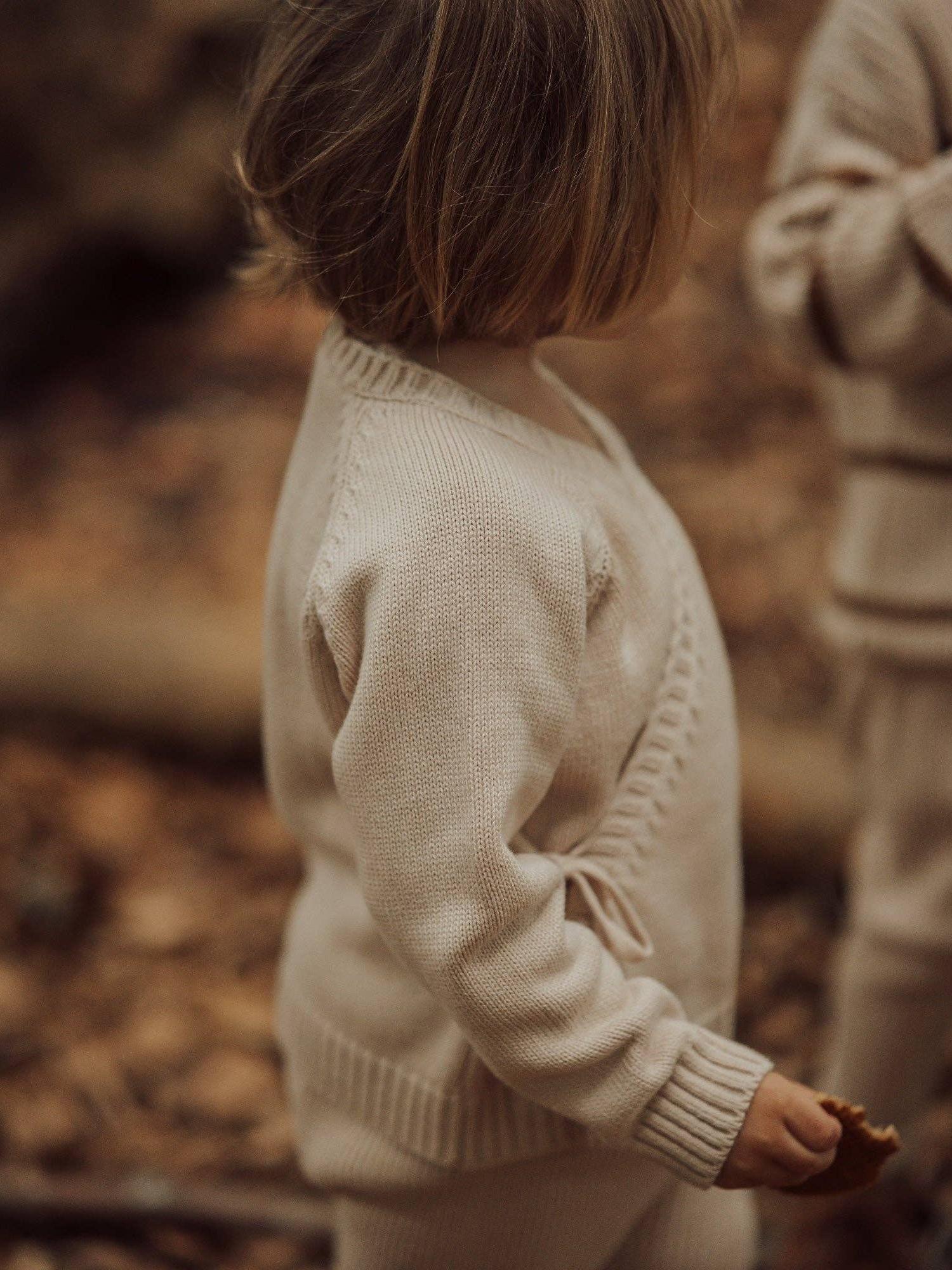 An iconic and timeless wardrobe classic that never goes out of style. It's produced in soft as butter cotton, so it feels like the little body is being embraced by a nice warm hug. The sleeve cuffs are ribbed for added comfort, and the cardigan closes with a button on the inside and a tie band on the outside to adjust the fit. This cardigan can be used both as a knit sweater and a cardigan with a top underneath.