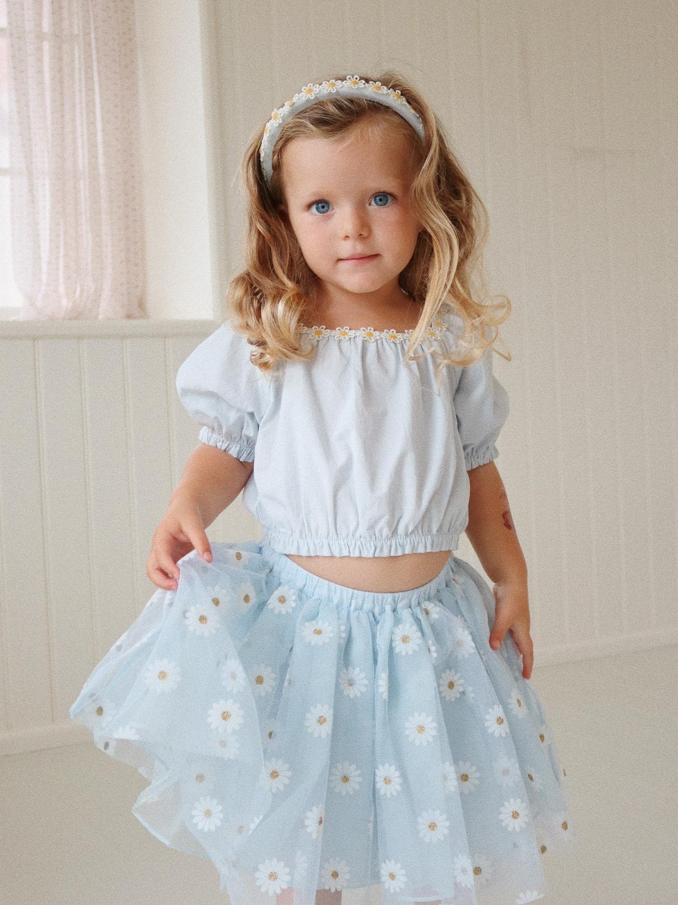 The skirt has a blue underskirt and two layers of tulle, the outermost of which has cute little daisies with a gold glittering center.