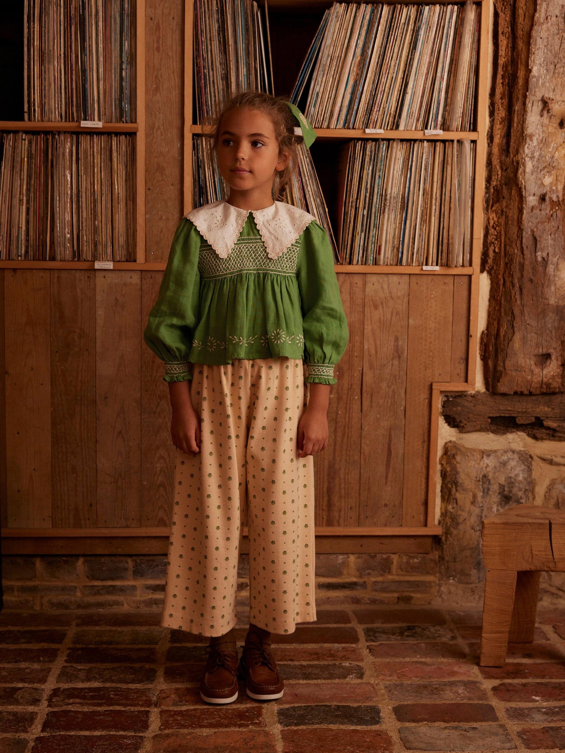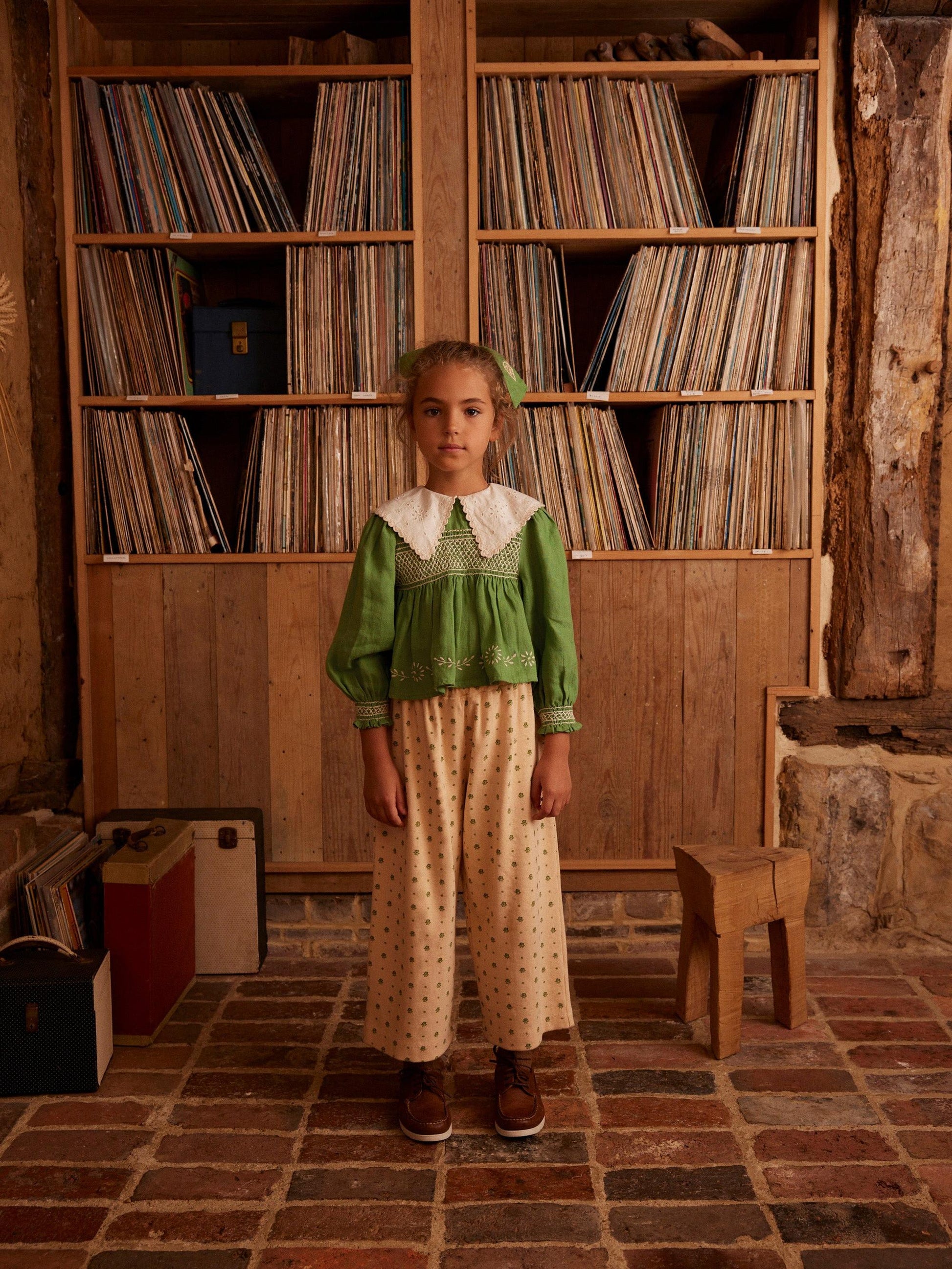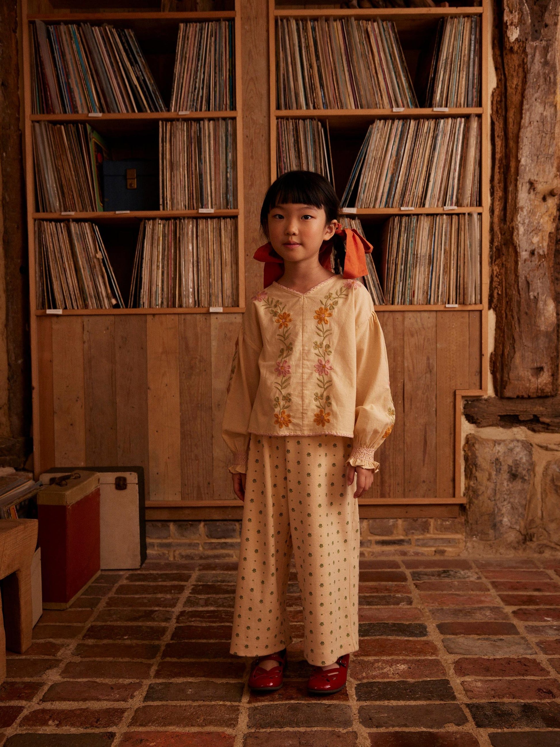 Crafted in the softest ribbed cotton jersey in ‘meadow calico’, the Mila trouser has a relaxed, wide leg silhouette with elasticated, adjustable waist for extra comfort, perfect for everyday play. We love her worn with our blouses or mixed and matched with our jersey tops.
