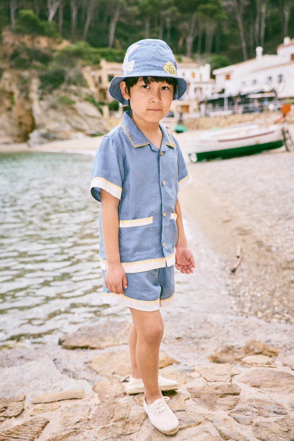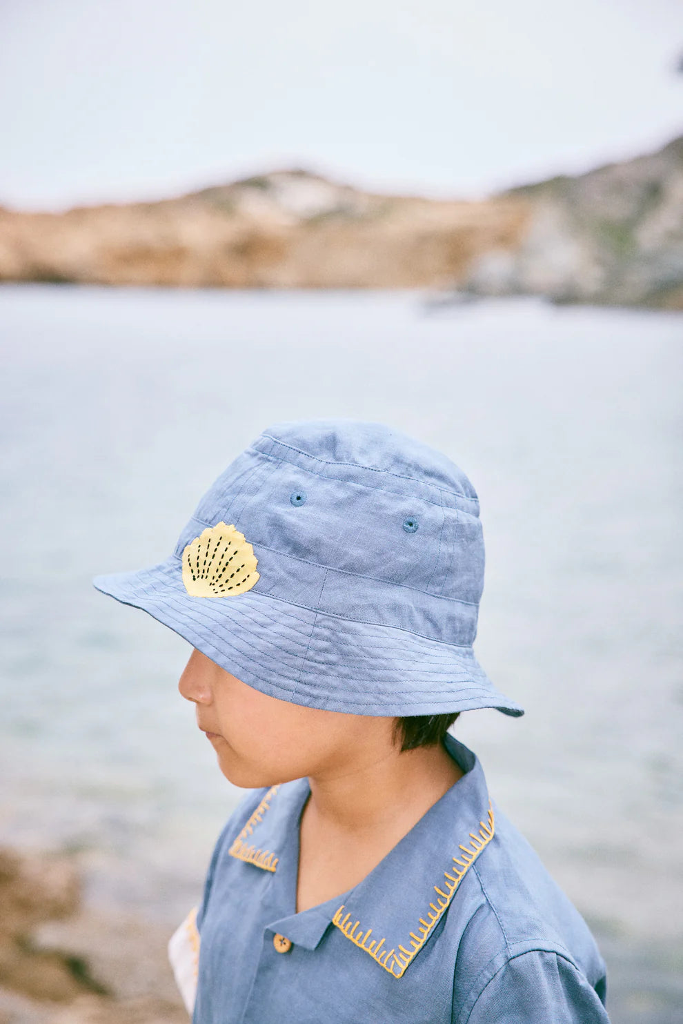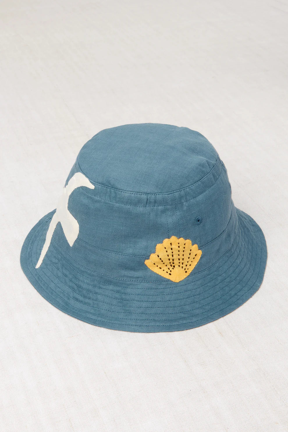 A classic bucket hat in lightweight lined woven linen, featuring hand-applied seaside appliqué motifs with hand-embroidered details. A go-to favorite for the warmer months.