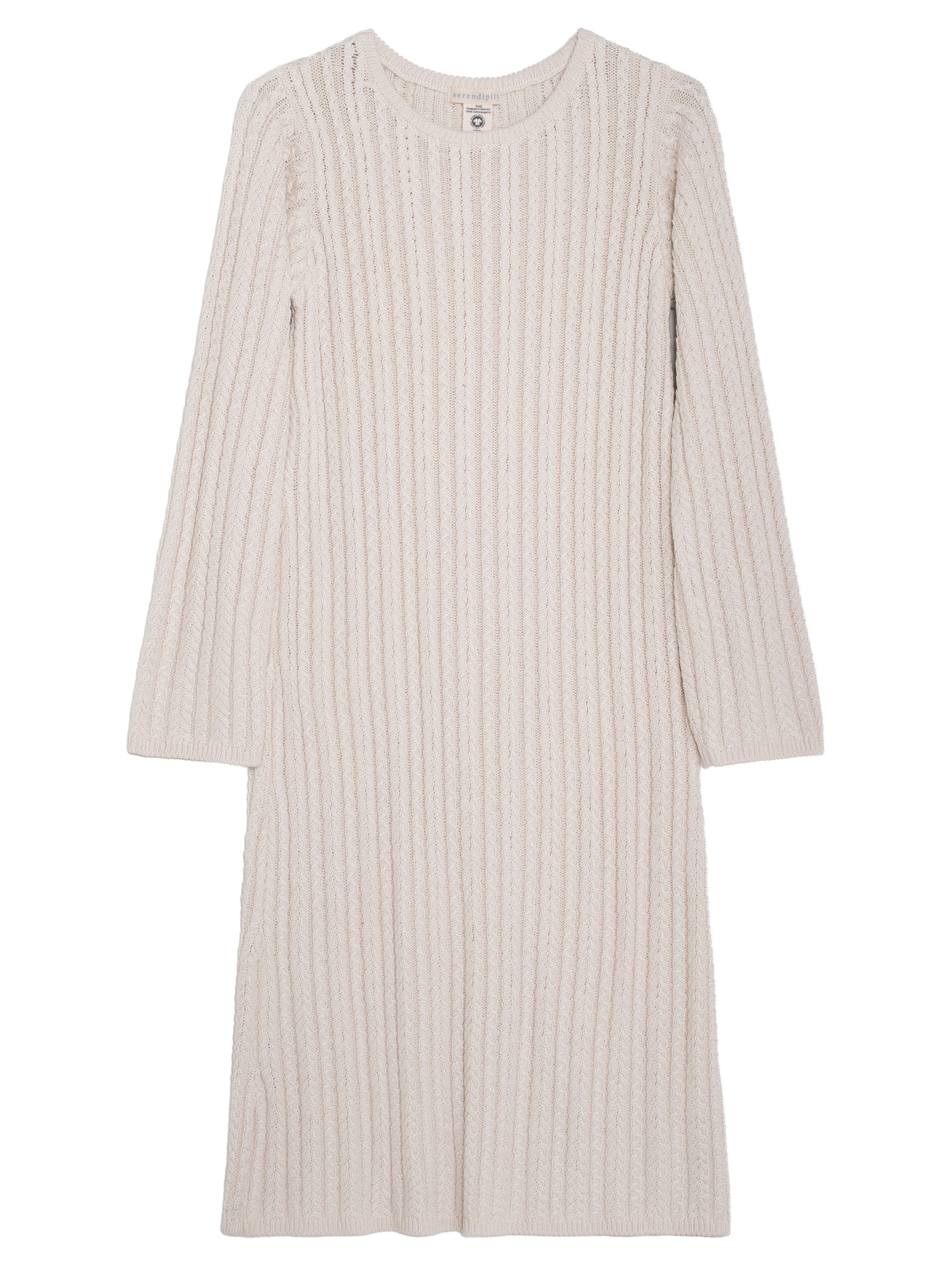Elevate your wardrobe with this cream-colored cable knit dress, crafted from 100% GOTS-certified organic cotton. Featuring a beautiful textured knit pattern, this sustainable dress is both soft and breathable—ideal for year-round wear.