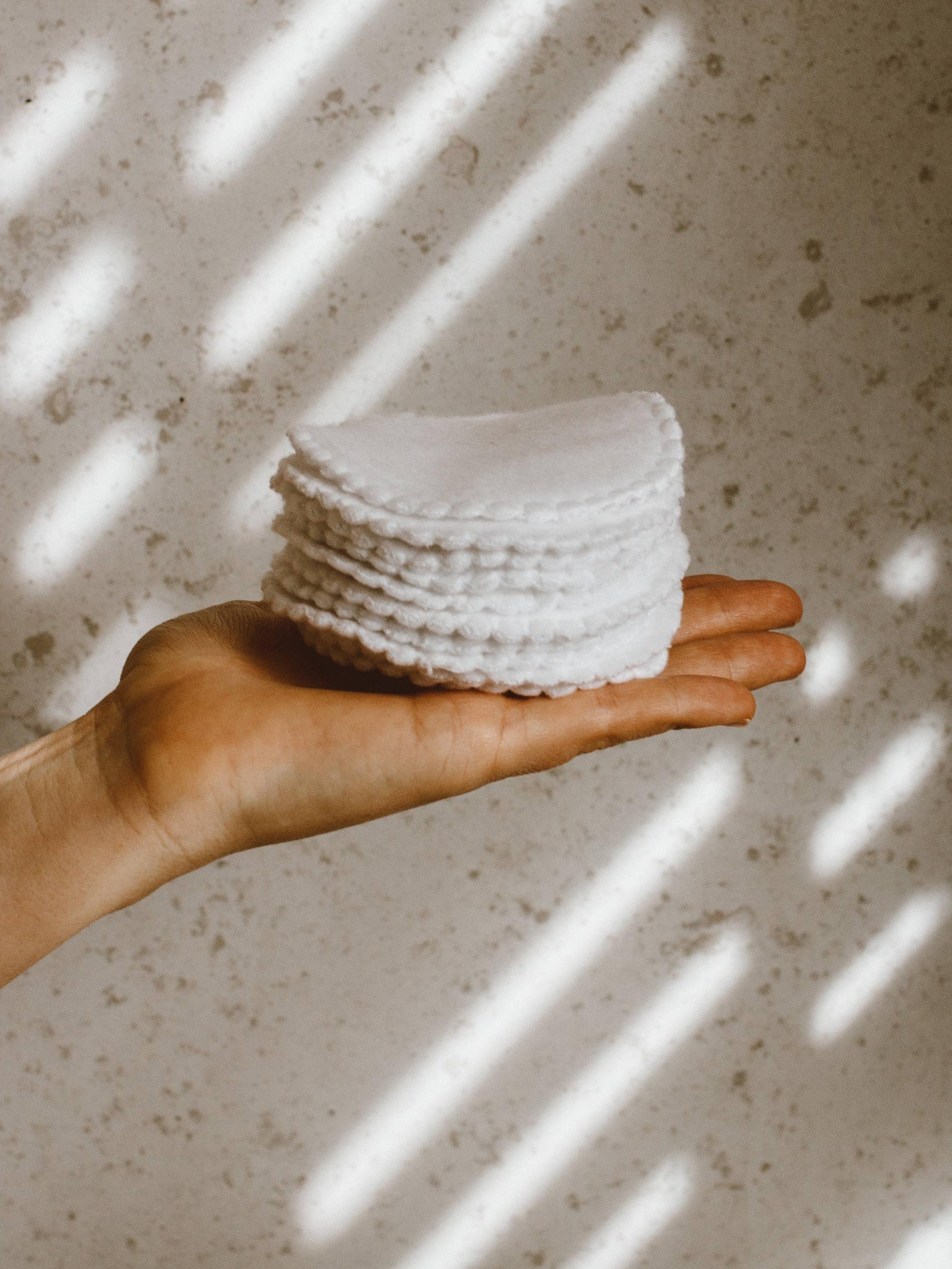 Our cotton rounds are made from the softest cotton fleece, we tested many different fabrics and our cotton fleece is by far the best for sensitive skin. It's very absorbent, heavenly soft and contains no harmful chemicals as the fabric is GOTS certified organic cotton.
