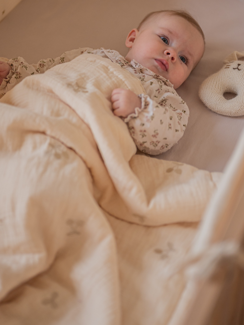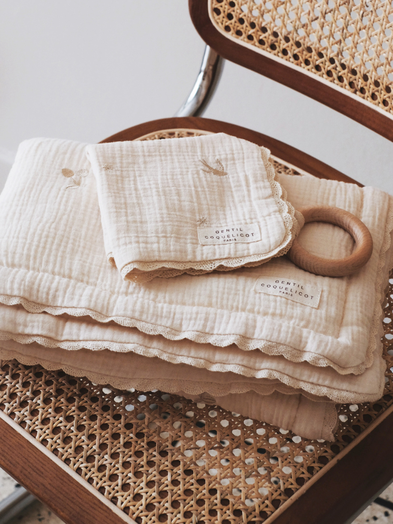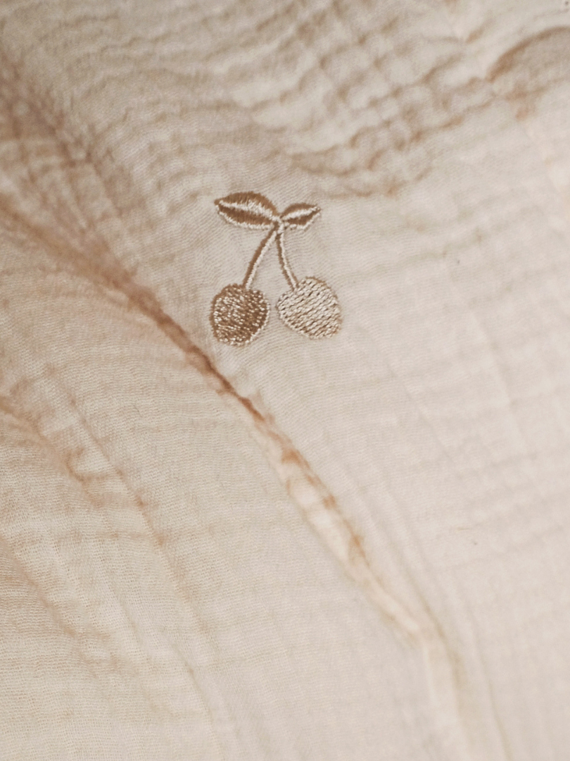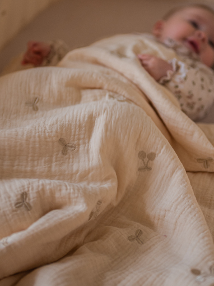 Superb quilted baby plaid in cotton gauze entirely embroidered with cherries and small clovers. Our new country pattern can only please you and will fall in love with mothers-to-be. This padded baby blanket will be perfect for naps and baby nights, it is soft, warm and decorated with pretty crooked lace.