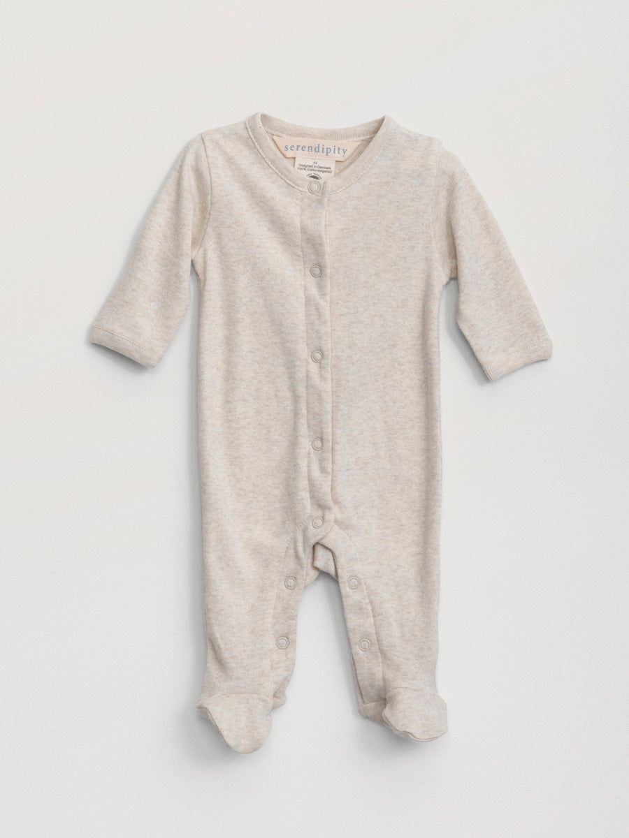 Soft and comfortable baby one-piece with long sleeves, full opening in front and feet for new-borns. Signature Serendipity melange rib in light sand/ shell colour. The baby suit has snap buttons in the front and by the legs for easy diaper change. 100% organic cotton and GOTS certification.