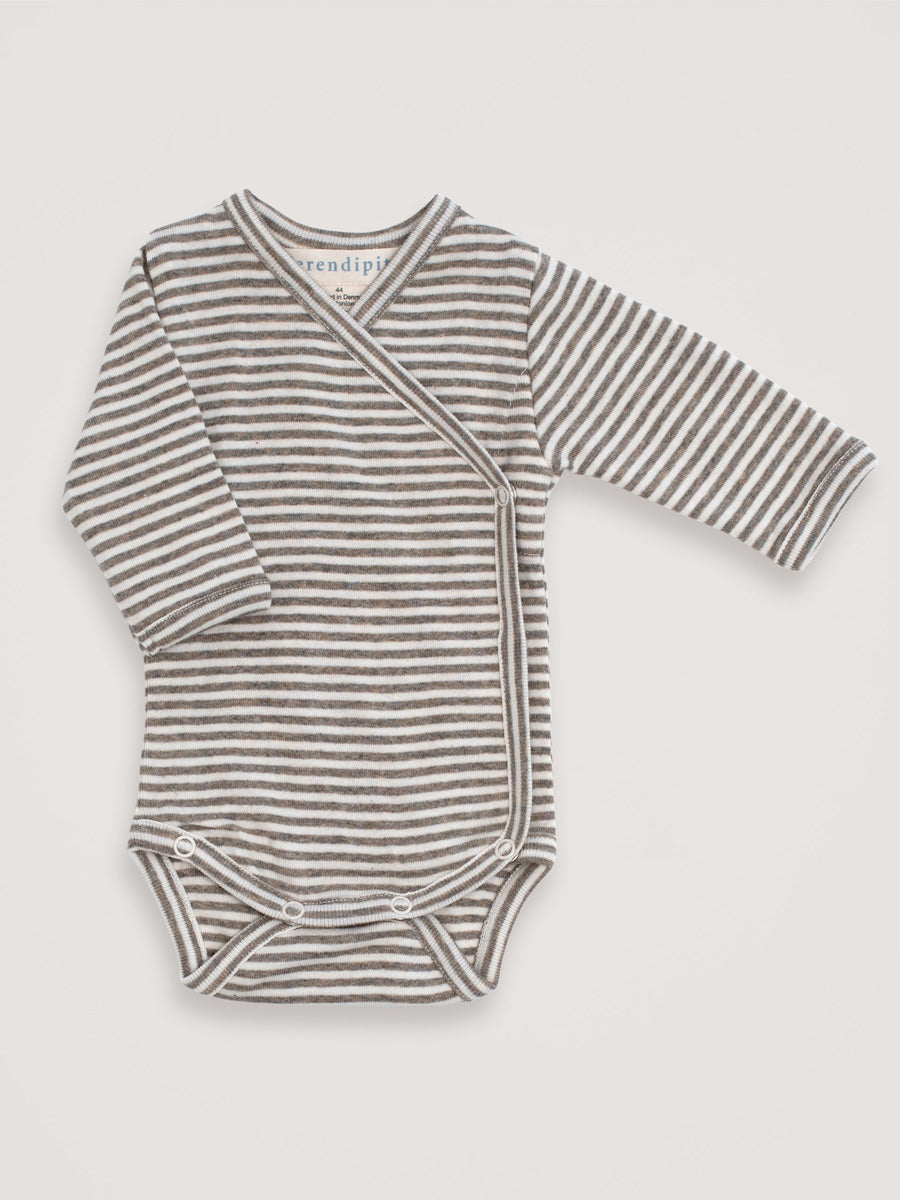 Striped body in greyish brown melange and off-white striped rib with wrap closing for easy change. Comfortable and practical for new born baby. Opening with push buttons. Sizes 38-44 has an extra opening on right side for tubes. 100% organic cotton and GOTS certification.