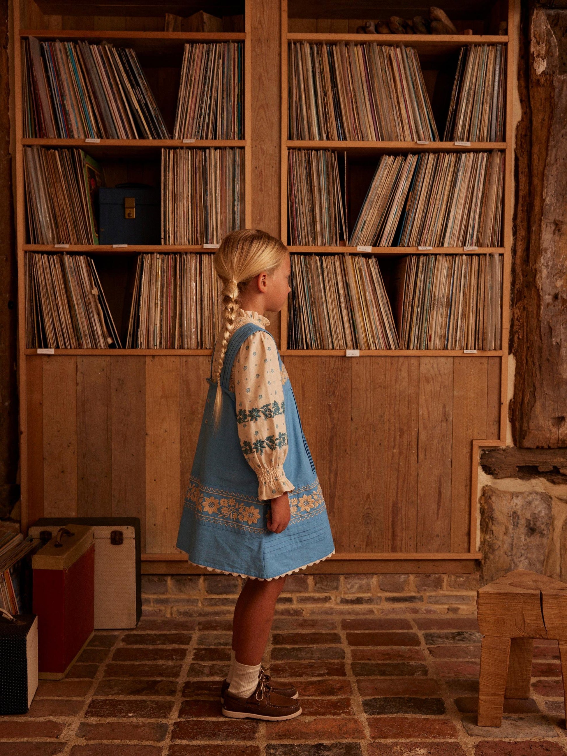 The pretty new Vittoria apron shift dress is a retro-inspired style with a sweet Scandinavian mood. Crafted from our stunning ‘Nordic blue’ cotton-linen, Vittoria features rows of pintucking to straps and skirt, and the sweetest contrast floral embroideries at chest and skirt. Finished with a contrast ric rac trim at hem. Three button fastening at back. We love Vittoria worn with the season’s blouses or simple jersey layers for everyday wear.