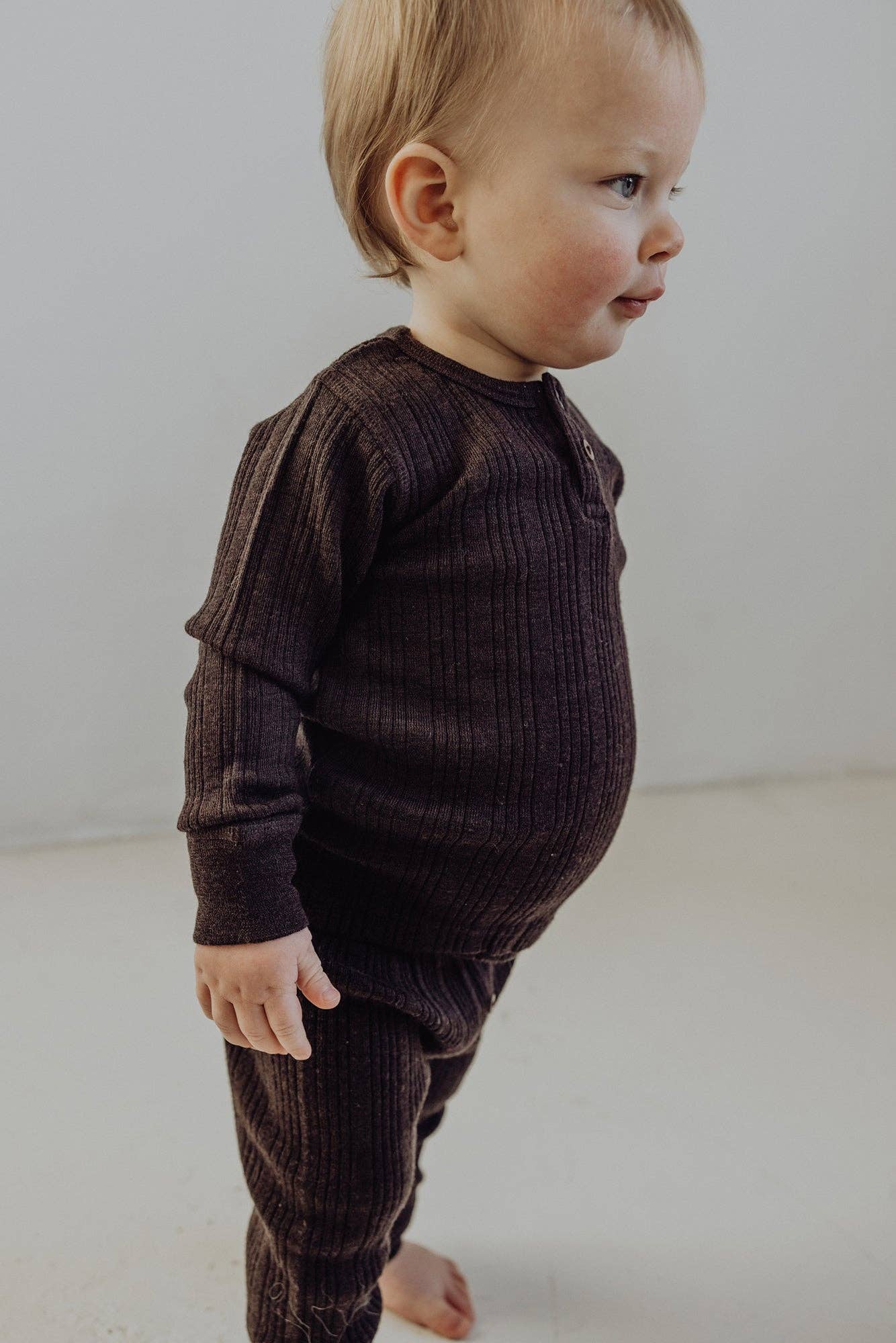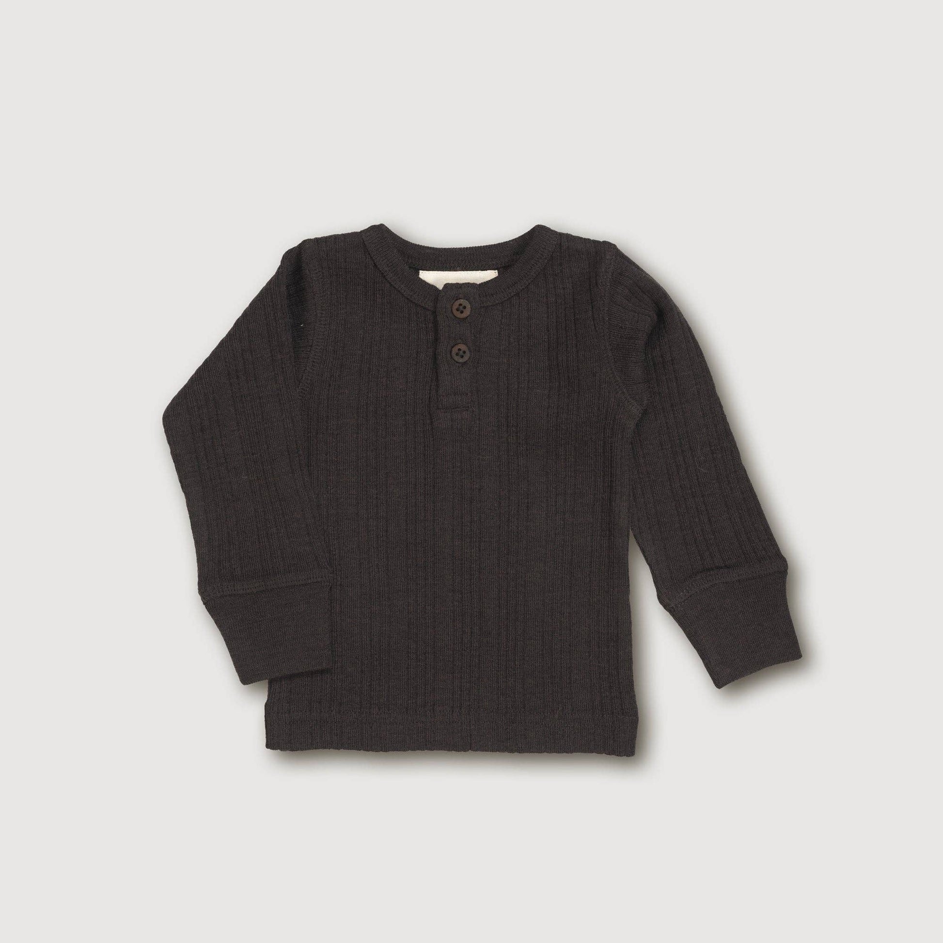 Keep your little one warm, comfortable and stylish in our beautiful ribbed wool-bamboo essentials. Long sleeve henley top with coconut button closure in beautiful dark heather gray color. Slim fit. Perfect for everyday wear, as a layering piece or as part of your little one's favorite pj's.
